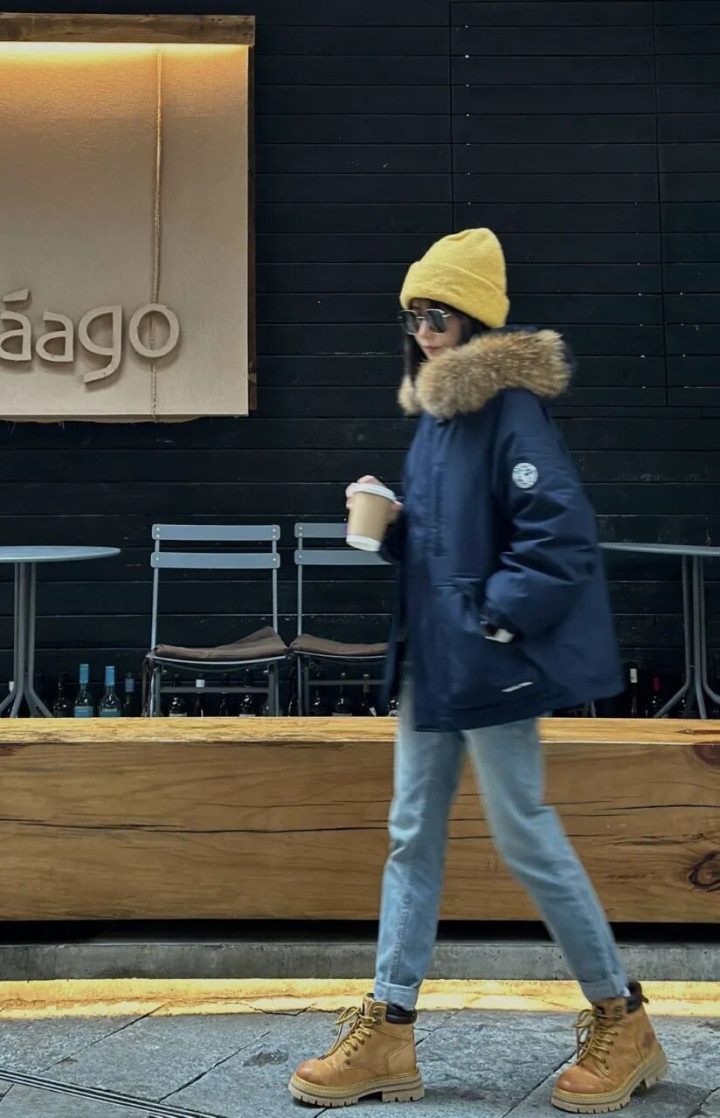 派克服+牛仔裤:马丁靴+毛线帽,街头潮东说念主范