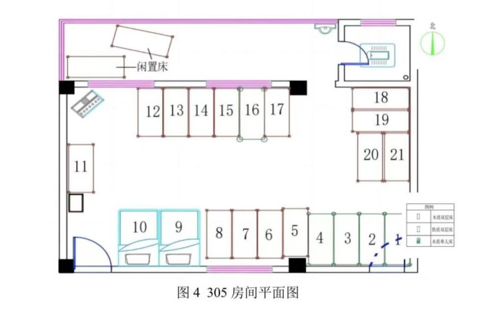 据官方所公布失火事故探访敷陈中寝室平面图,发火房间分住宿、阳台、卫生间三个部分。住宿部分,南、北各一瞥床铺,两排床铺中间是过说念。