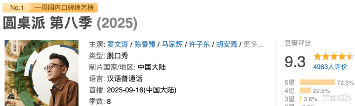 但偏巧,这部《圆桌派》从2016年播到当今,仍是走到第八季,豆瓣评分恒久稳在9分险峻,最新一季更是径直冲到9.3。