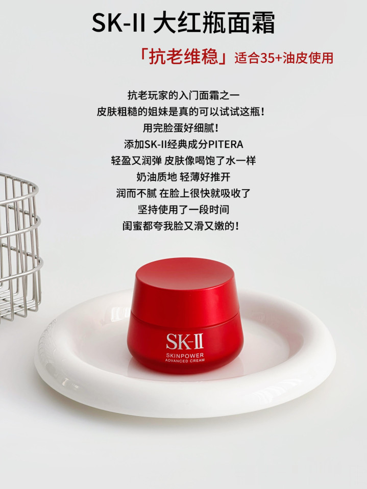 起原的第1瓶贵妇抗老面霜,这个符合年齿稍稍大少许的,肌肤陈腐皮肤情景差的,大红瓶更能干肌肤抗氧化,中枢身分PITERA身分,可以改善肌肤油脂分泌,均衡肌肤水油,从而邃密肌肤、缩毛孔。